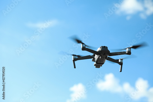Fototapeta premium Modern drone with camera flying in sky on sunny day