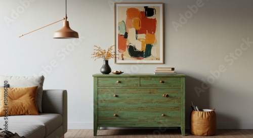 © Burak, Obraz premium Modern Earthy Living Room with Green Dresser and Abstract Art