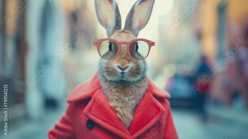 Obraz premium Modern Easter bunny wearing fashion sunglasses and a red coat. Standing in the street and announcing the arrival of Easter. Easter concept.