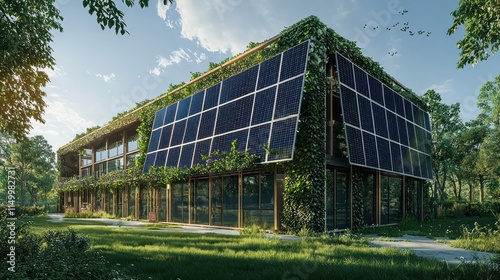 Fototapeta premium Modern Eco Friendly Building With Solar Panels And Greenery