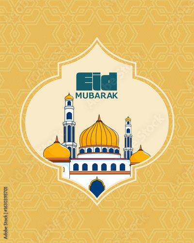 Naklejka premium Modern Eid Mubarak greeting with an intricate Islamic mosque illustration, enclosed in an elegant arch frame. The yellow geometric background enhances the festive and cultural appeal.