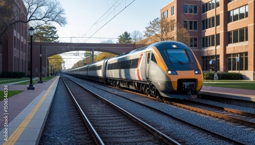 © Fristy, Naklejka premium Modern electric passenger train arriving at the platform during the daytime