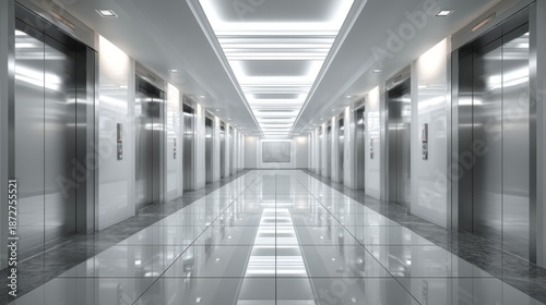 © 69, Fototapeta premium Modern elevator hall with glossy floors and bright lights in a contemporary building interior design