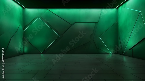 Fototapeta premium Modern emerald geometric Interior with Neon Lighting. Empty Room for Product...