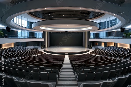 © Dhiditz, Fototapeta premium Modern Empty Auditorium Interior with Stage and Tiered Seating Architecture