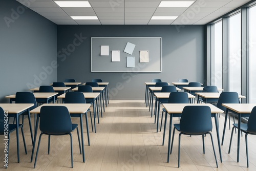 Fototapeta premium Modern empty classroom interior with minimalist furniture, large windows, and...