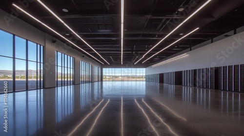 Fototapeta premium Modern empty event space with large windows and polished concrete floor, showcasing bright linear lighting.