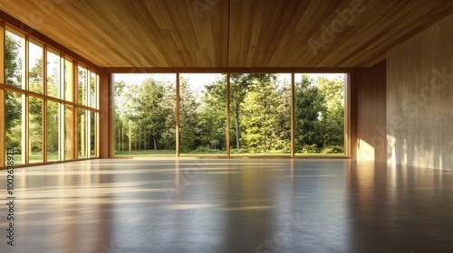 Fototapeta premium Modern Empty Hall Overlooking Scenic Nature - Ideal for Events and Gatherings