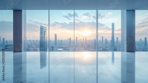 Fototapeta premium Modern empty office building and city skyline outside the window