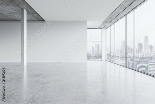 © Ikhwan, Fototapeta premium Modern empty office, city view, concrete floor, highrise