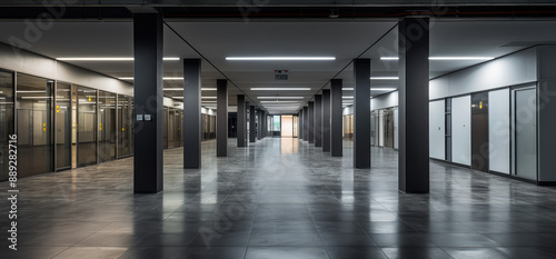 © evening_tao, Obraz premium Modern Empty Office Corridor with Glass Panels