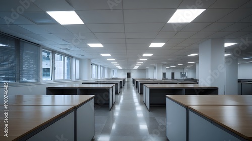 © Thares2020, Naklejka premium Modern empty office interior illuminated by rows of bright fluorescent ceiling lights