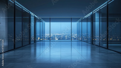 © bulegendut, Fototapeta premium Modern empty office with city view at night.