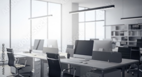 © Yohanessoekamti, Fototapeta premium Modern Empty Office Workspace Background with Minimalist Design and Bright Natural Light
