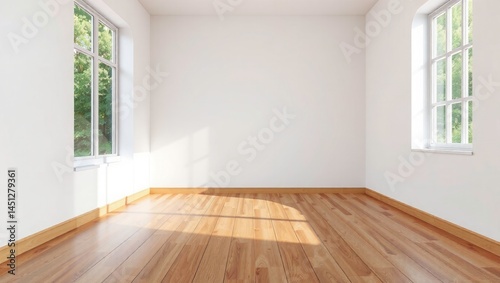 © Caitlin, Obraz premium Modern Empty Room Design with Wooden Floor and Outdoor Foliage 3D Render