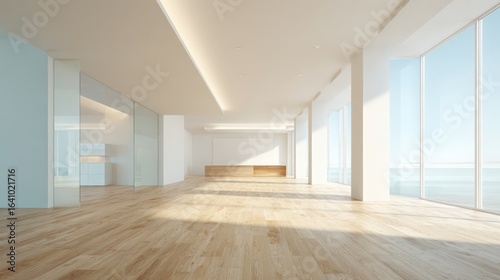 Obraz premium Modern Empty Room Interior with Hardwood Floor, White Walls, Large Windows...