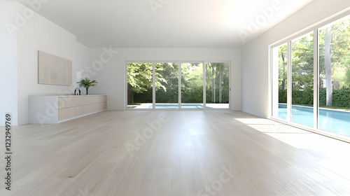 Fototapeta premium Modern empty room, pool view, sunlight, hardwood floor, home interior design
