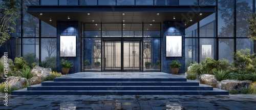© ngstock, Obraz premium Modern Entrance of High-Tech Company with Digital Displays and Lush Green Landscaping at Dusk