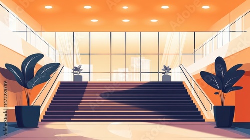 Naklejka premium Modern entrance with stairs and potted plants in bright orange tones...