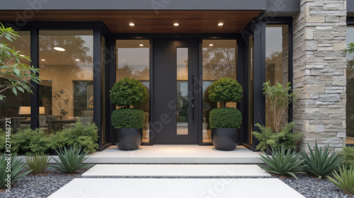 Obraz premium Modern entrance with stylish planters and elegant landscaping