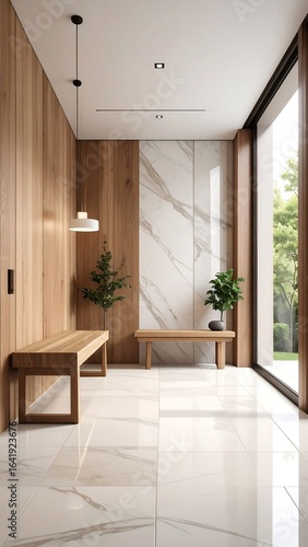 © Poni, Fototapeta premium Modern entryway with wood and marble
