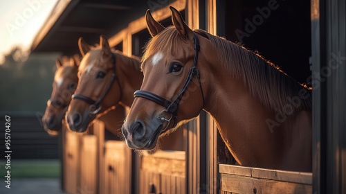 © julija, Fototapeta premium modern equestrian haven sleek minimalist stable interior with three curious horses peeking from polished wood stalls bathed in soft natural light