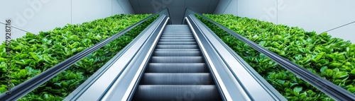 Obraz premium Modern Escalator Surrounded by Lush Greenery in a Contemporary Shopping Mall...
