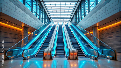 © Mobasser, Fototapeta premium Modern escalators in contemporary building interior