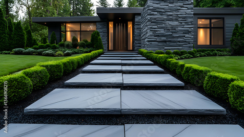 © kang, Fototapeta premium Modern Estate Entrance with Stone Walls and Bronze Gates