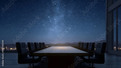 Obraz premium Modern executive boardroom overlooking a city skyline under a vast starry night sky