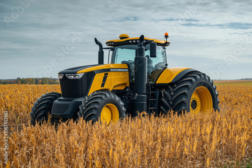 © Dzmitry, Obraz premium Modern farmer operating GPS-equipped tractor in golden cornfield at dusk