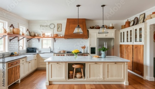 © Kitta Studio, Fototapeta premium Modern Farmhouse Kitchen with Warm Wood Accents and Open Shelving