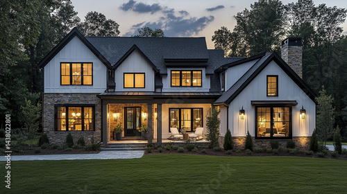 © Thanthara, Obraz premium modern farmhouse style home with glowing lights at dusk, surrounded by greenery