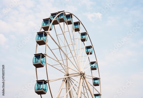 Fototapeta premium Modern ferris wheel with blue cabins against a clear sky backdrop