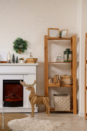 Fototapeta premium Modern fireplace with Christmas decorations in interior of living room