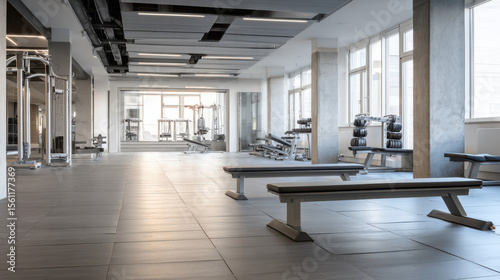 © Peter, Fototapeta premium Modern fitness equipment in a sleek arrangement, symbolizing strength and precision in wellness.