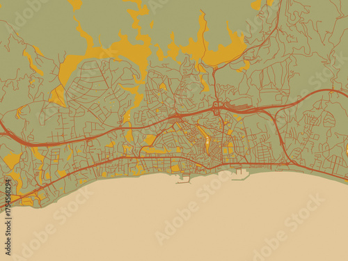 © W&S Stock, Obraz premium Modern flat map poster of Marbella, Spain in sage green ground with rust-red roads and ochre accents.