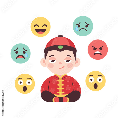 Naklejka premium Modern flat vector of a relaxed Chinese boy cartoon with emoticons—happy,...