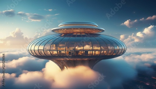 © Kanchana, Obraz premium modern floating structure surrounded by clouds showcasing innovative design and creativity