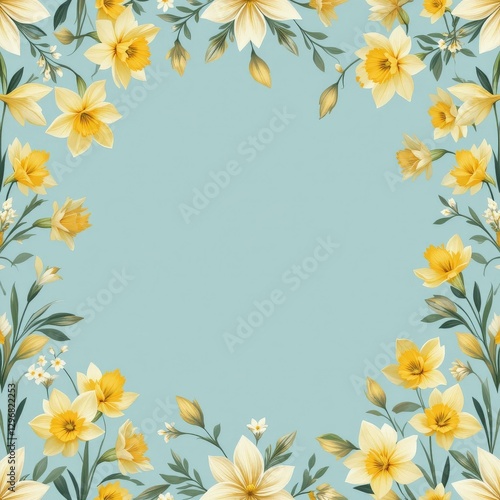 © Skyfe, Obraz premium Modern Floral Vector Illustration Yellow Daffodils Soft Pastel Blue Background - Decorative Border Design Copy Space Spring Easter Invitations Greeting Cards
