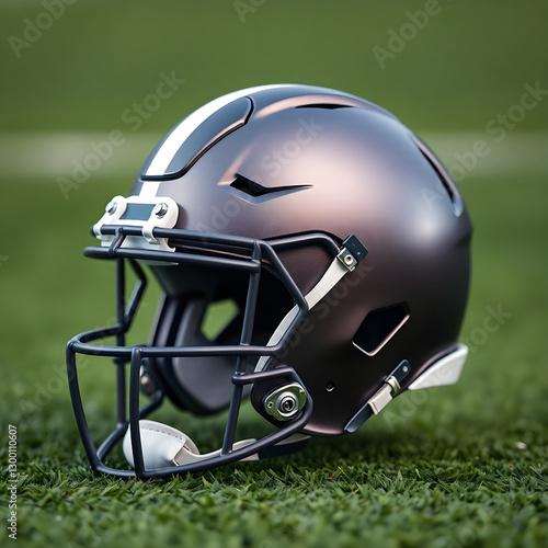 © Abdulloh, Fototapeta premium Modern football helmet resting on lush green field