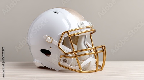 Fototapeta premium Modern Football Helmet with Gold Facemask and White Shell on Minimalist Background