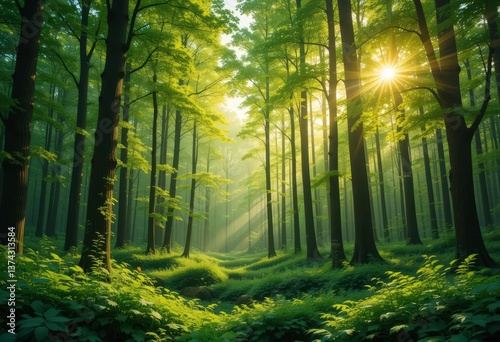 © Sanook, Obraz premium Modern Forest Digital Art of Sunlit Canopy