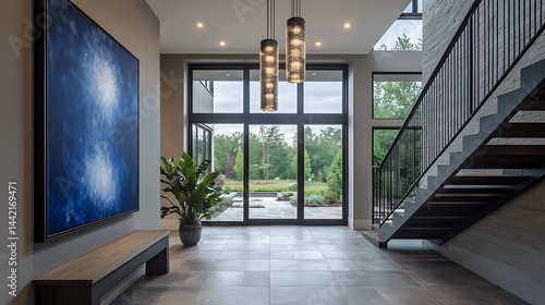 © BADAL, Obraz premium Modern Foyer with Staircase, Windows, and Large Blue Abstract Painting