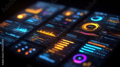 © The Little Hut, Obraz premium Modern futuristic user interface screen with digital graphs charts data analytics and control panels on dark high-tech background