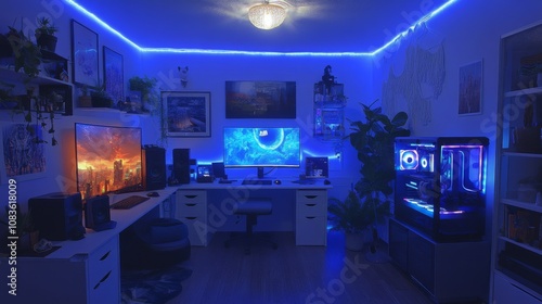 © Nafisaaliaputri, Fototapeta premium Modern Gaming Setup with Blue LED Lights and a Glass-Panel PC
