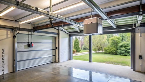 Fototapeta premium Modern Garage Interior with Open Doorway, Light Fixtures and Polished...