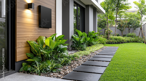 Fototapeta premium Modern garden design with lush greenery and stone pathway