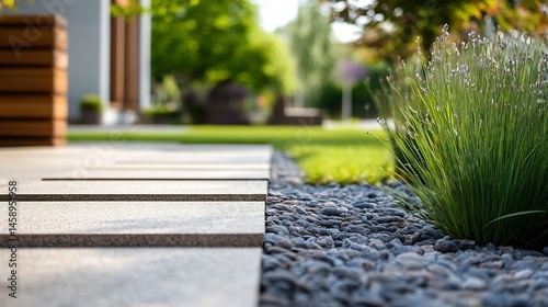 Fototapeta premium Modern garden pathway with beige stone slabs, dark grey pebbles, and lush...