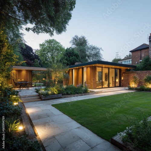 © Sanrobone, Obraz premium Modern garden structures, illuminated pathway, evening scene